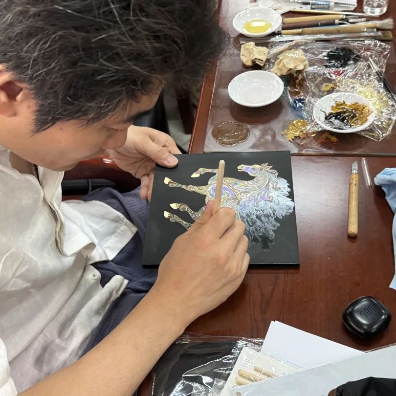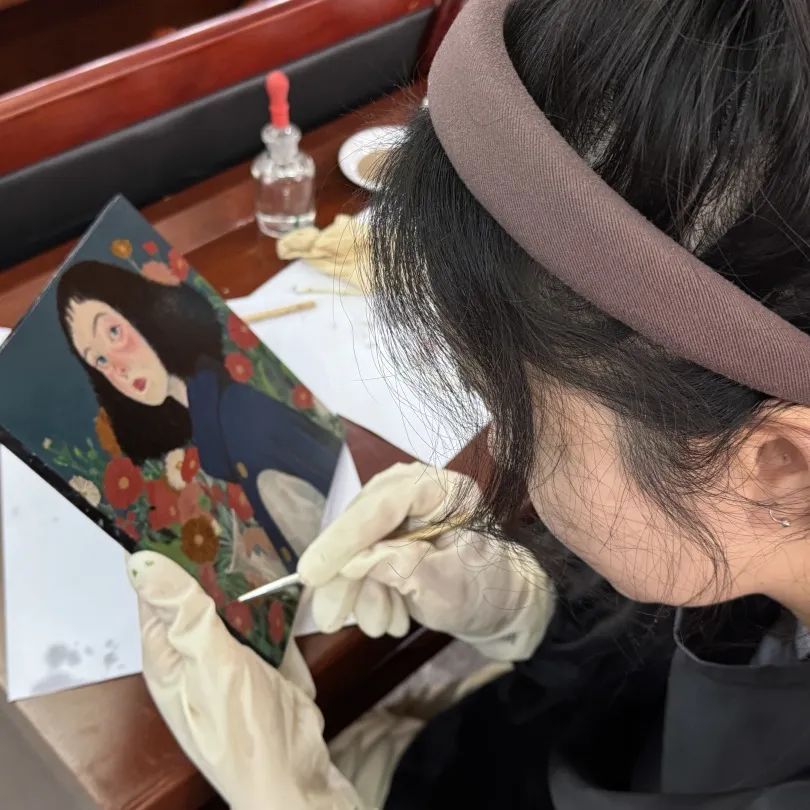 学员们在理论学习强基的同时,通过实操竞赛砺能。在授课老师的指导下,选手们根据设计图稿,调配色漆,选择工具,通过彩绘、描金、描银、搜金、贴箔等多种工艺完成艺术实践,并作经验分享,6位选手从不同角度分享了在此次项目中的收获和感悟。