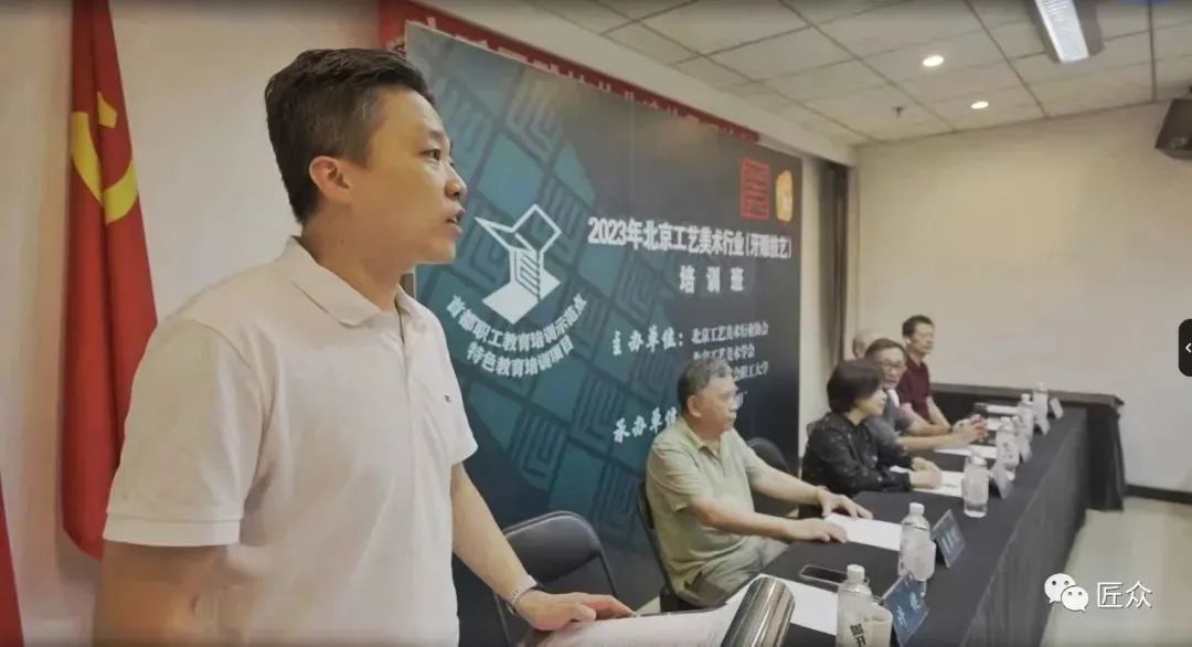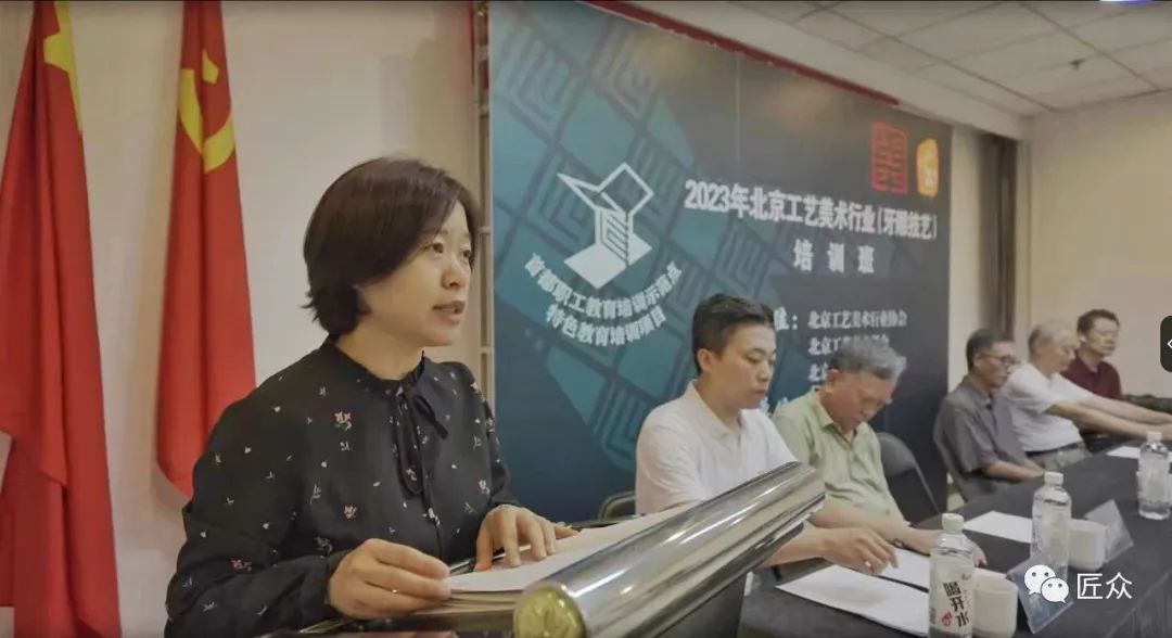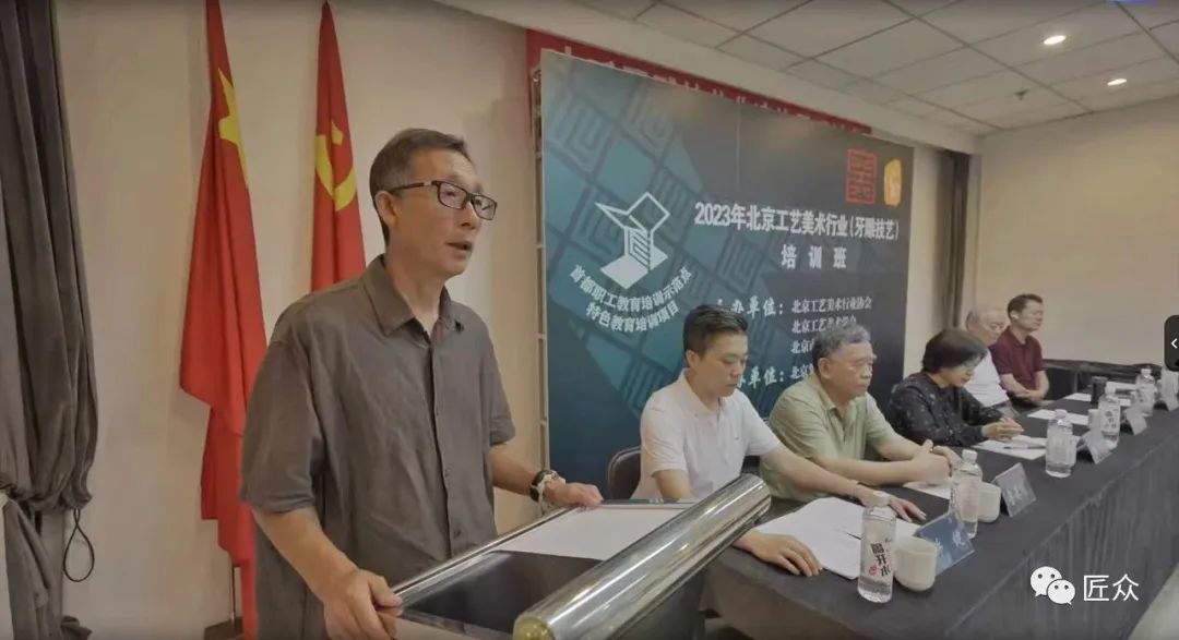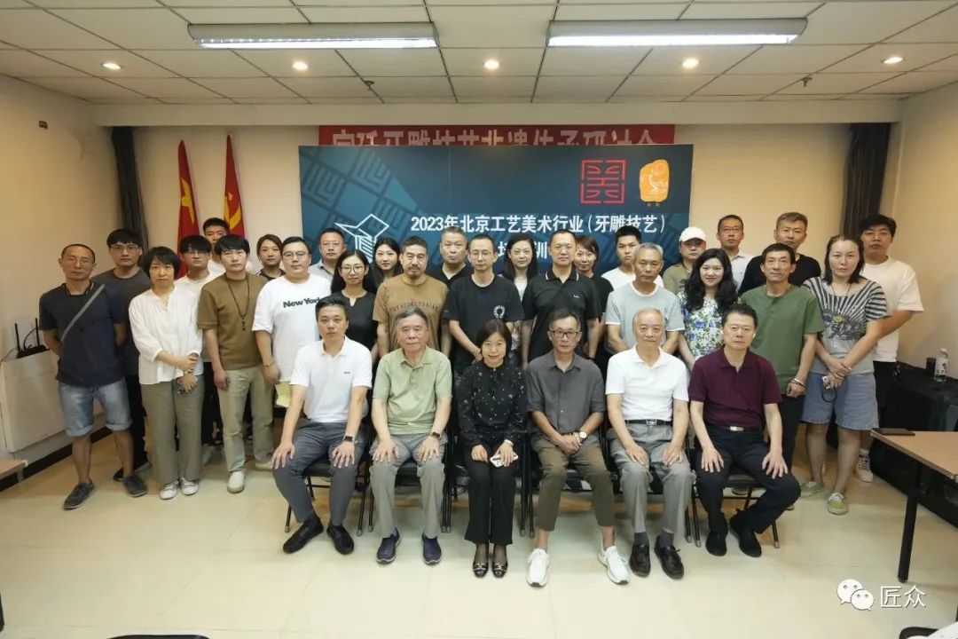 2023年8月11日上午,由北京市总工会政策支持,北京工艺美术行业协会、北京工艺美术学会主办,北京象牙雕刻厂承办的2023年首都职工教育培训示范点特色培训项目“北京工艺美术行业(牙雕技艺)培训班”正式开班。北京市总工会职工大学副校长杨秀艳,北京工艺美术学会常务副理事长兼秘书长叶晓溪,北京象牙雕刻厂总经理许健,牙雕技艺国家级代表性传承人、中国工艺美术大师李春珂,牙雕技艺国家级代表性传承人、中国工艺美术大师柴慈继,中国工艺美术大师、北京市劳模郑士儒以及培训班全体30名学员参加了开班仪式。
