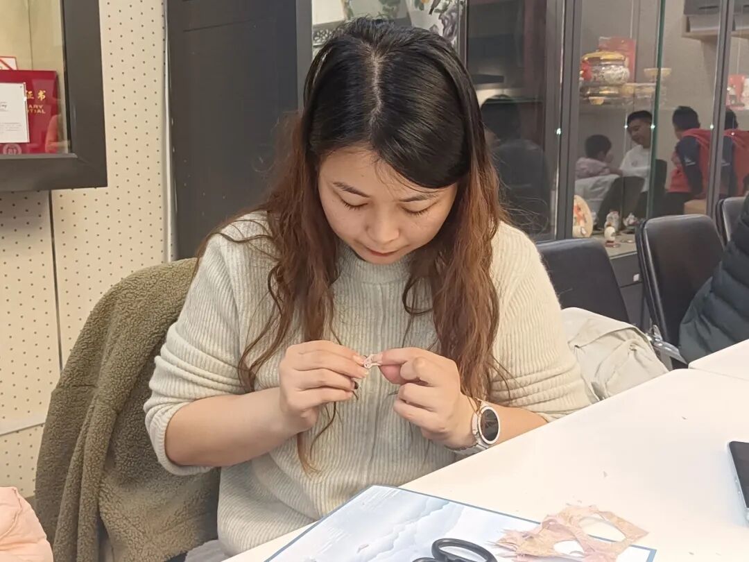 大家将学到的技法融入实践,从材料裁剪到嵌合塑形,一步步完成属于自己的非遗作品。原本专注于科研工作的科技工作者们,在指尖与绸缎的互动中放松身心,感受着非遗技艺带来的别样乐趣。